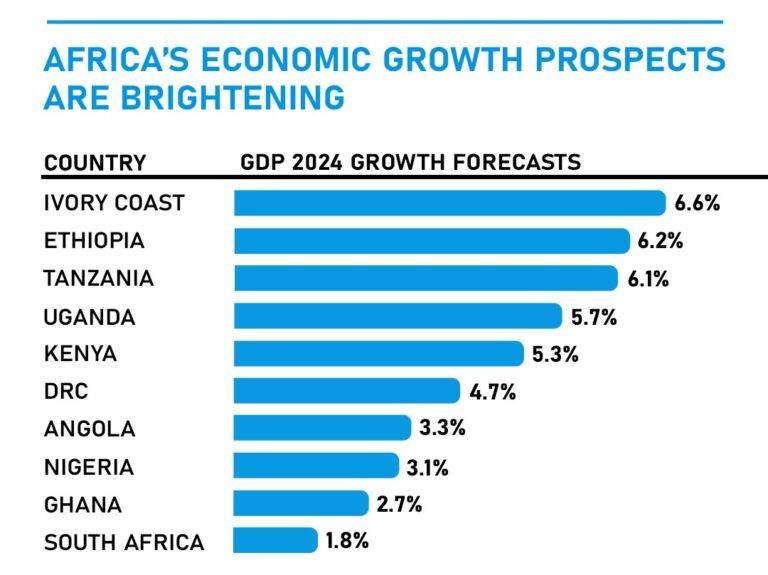 A ray of growth and economic outshine is expected as sub-saharan africa’s growth is accelerating with two of its biggest economies leading the way. Ivory Coast, one of the largest producers of cocoa is projected to have 6.6% growth, having surpassed south africa as the highest rated sovereign in sub-saharan africa with foreign debt outstanding. Having said that, it is also anticipated that Tanzania will also beat 6%, according to the IMF. Africa’s economic growth prospects are brightening with Ethiopia now accounting for almost a 10th of GDP.