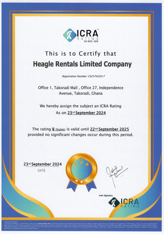 Read More...ICRA RATING assigns Heagle Rental Limited Company national scale long-term issuer rating to B Outlook Stable. B (Stable) rating means the entity is in a substantial credit risk position to fulfill its financial commitments. There is a high risk of being adversely affected by foreseeable events.