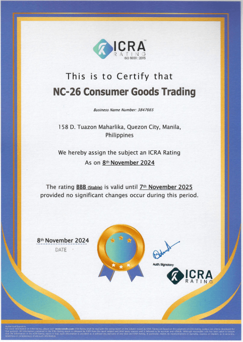 ICRA RATING assigns NC-26 Consumer Goods Trading national scale long-term issuer rating to BBB Outlook Stable....